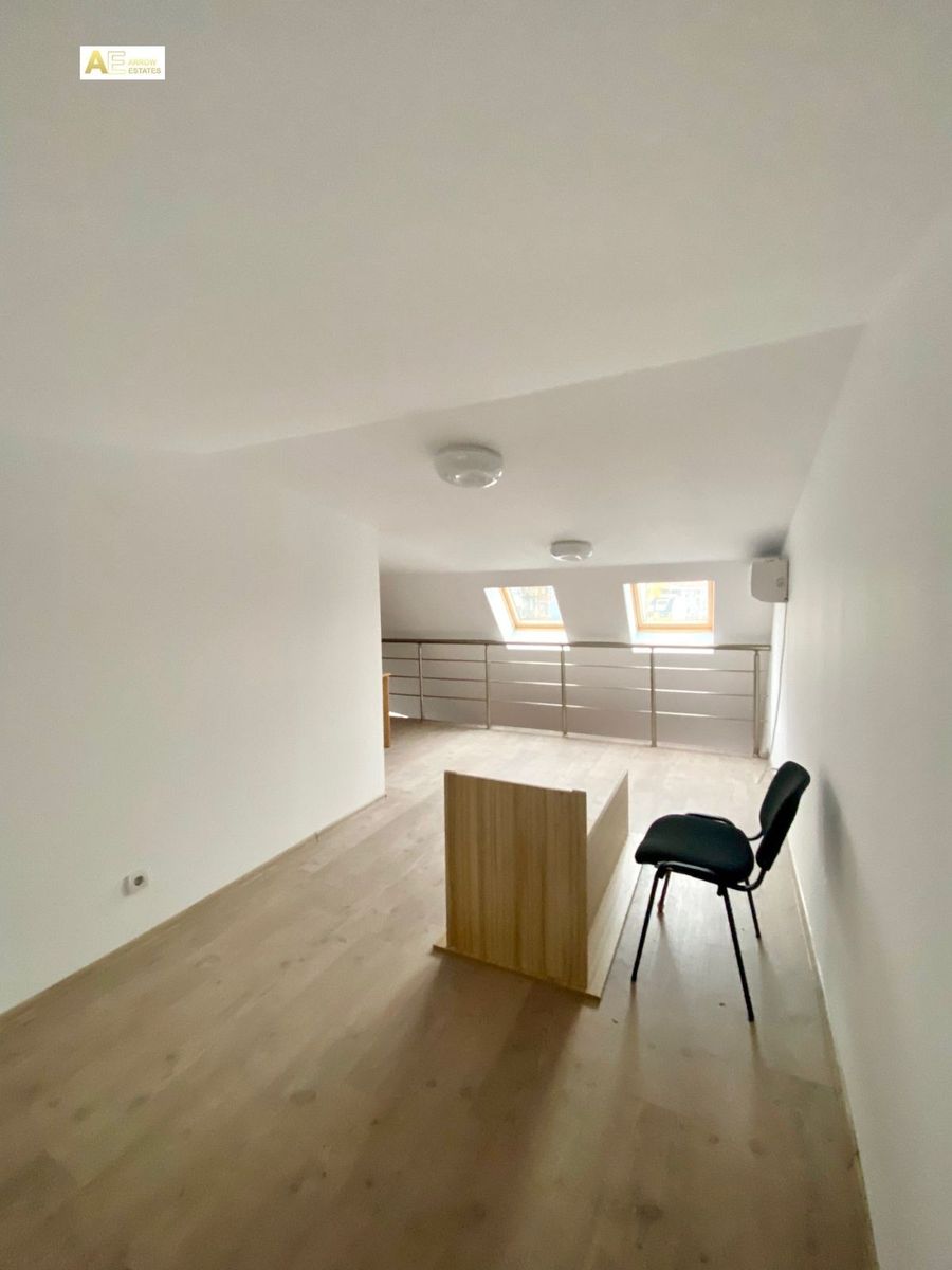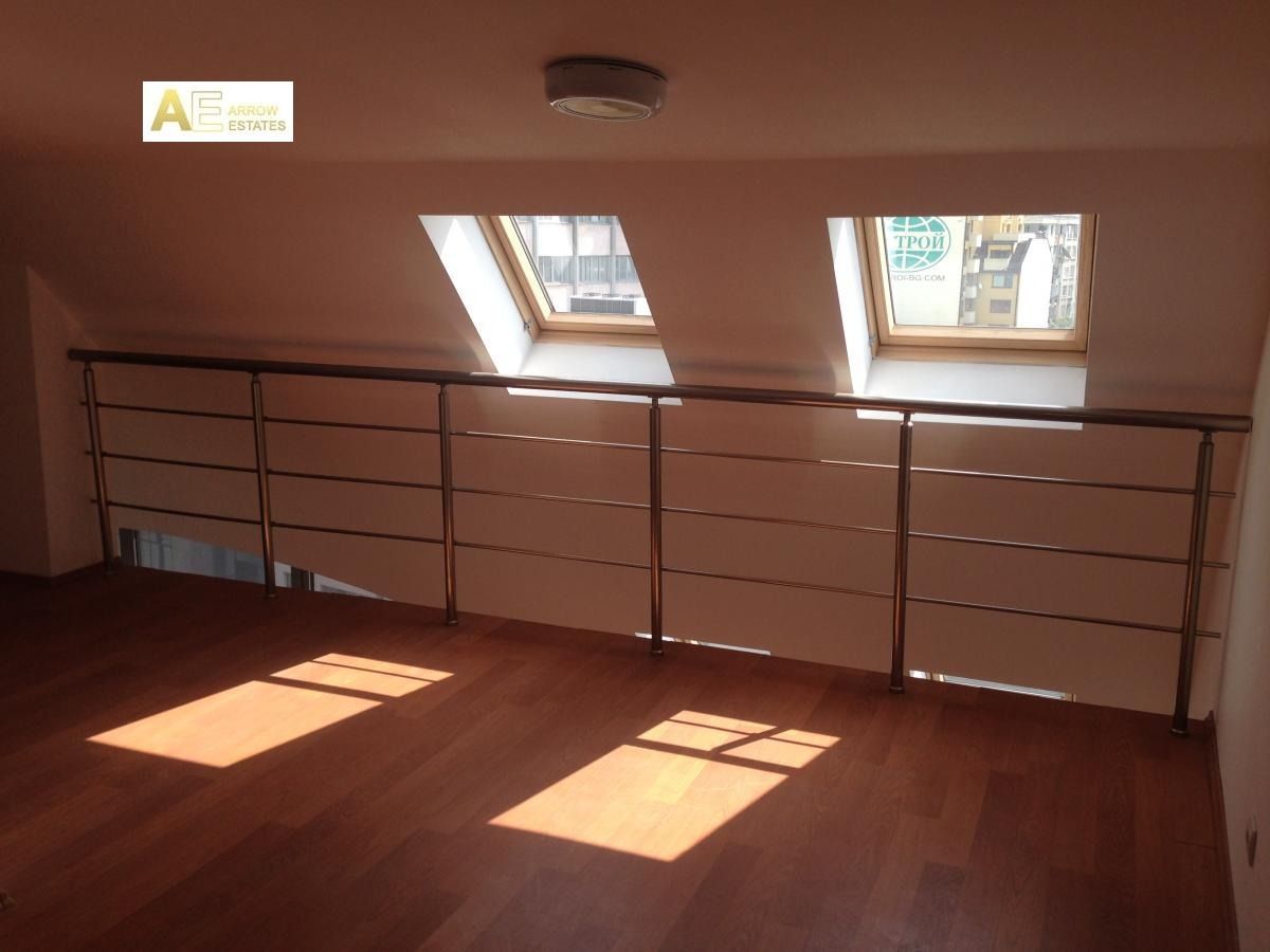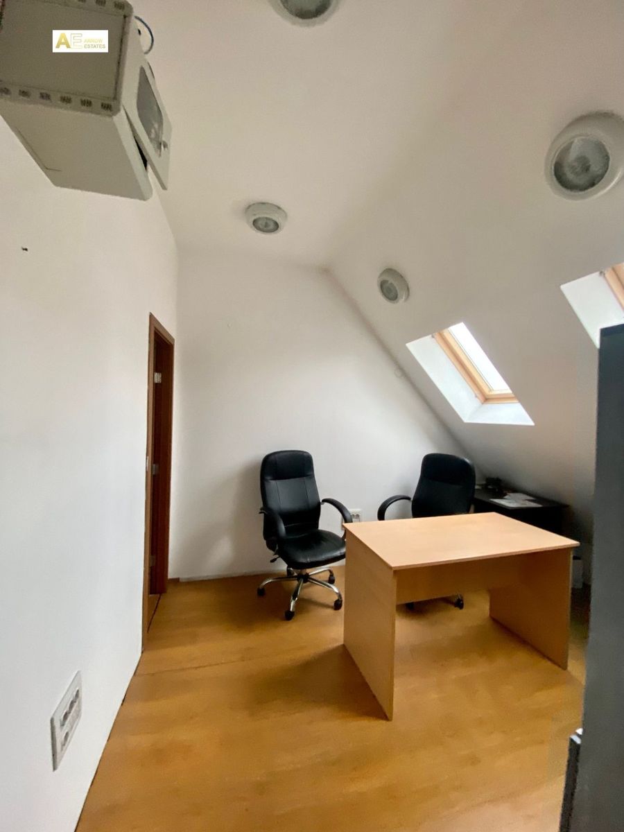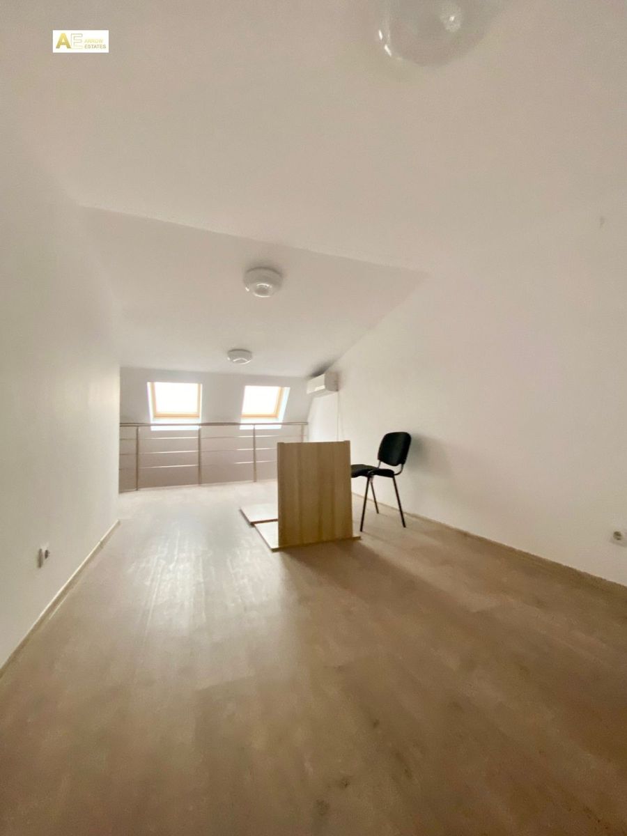Самостоятелен офис етаж разположен в бизнес център. Състои се едно помещение на две нива,тип мезонет с площ 120 кв.м.,два кабинета ,кухненски бокс,сървърно помещение и санитарен възел. В офиса са изградени окабеляване и климатизация.